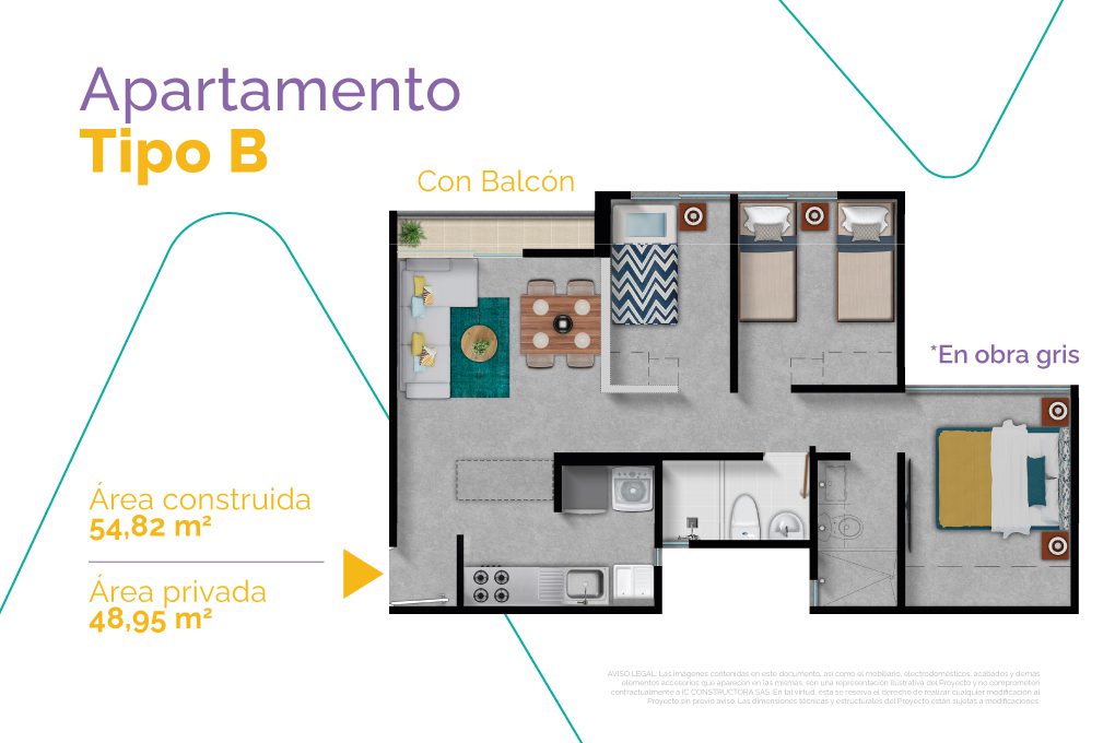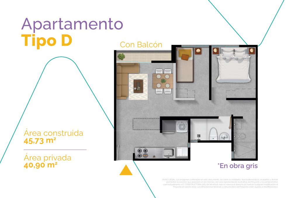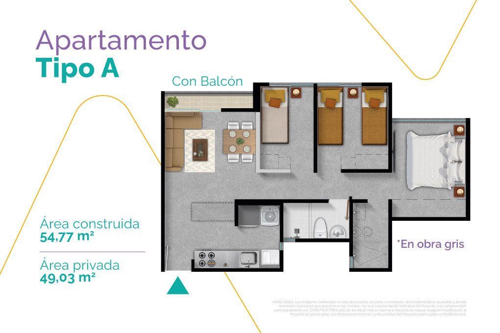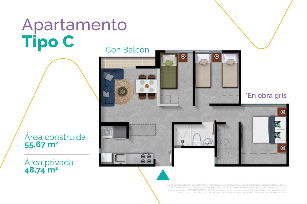 *AVISO LEGAL: Los apartamentos se entregan en obra gris, esta es una representación de cómo podría tener su apartamento, no describe de ninguna manera los acabados del apartamento, así como el inmobiliario, electrodomésticos, acabados y demás elementos accesorios que aparecen en las mismas, son una representación ilustrativa del Proyecto y no comprometen contractualmente a IC CONSTRUCTORA SAS. En tal virtud, ésta se reserva el derecho de realizar cualquier modificación al Proyecto sin previo aviso. Las dimensiones técnicas y estructurales del Proyecto están sujetas a modificaciones.